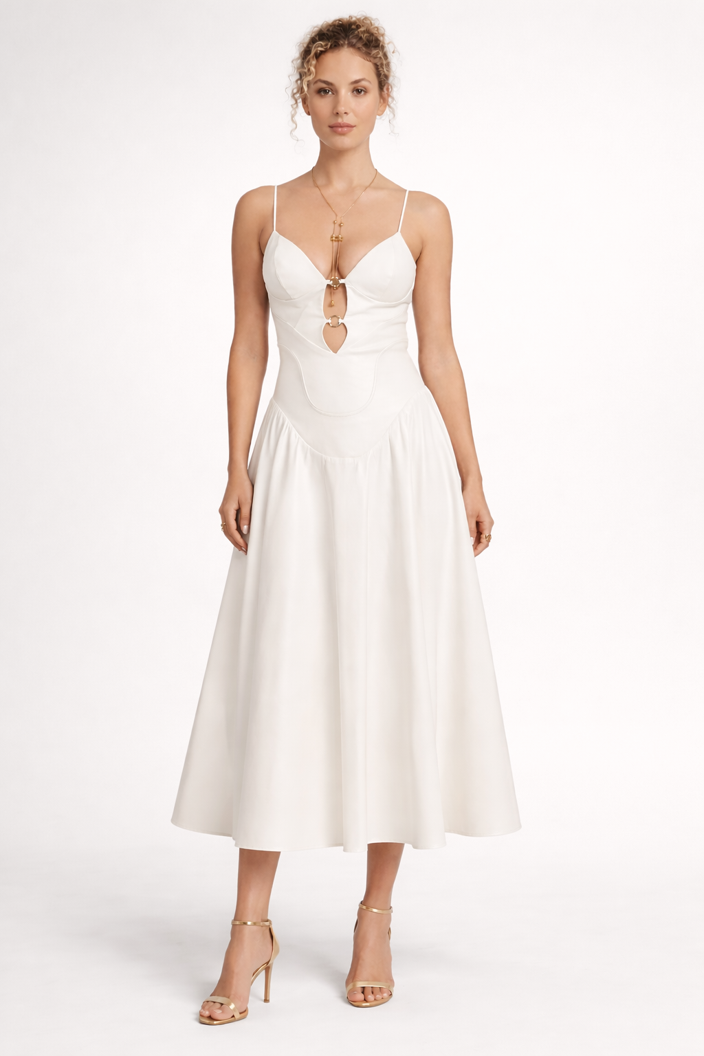 Women's White Genuine Leather Flared Midi Dress - Sweetheart Neck, Sculpted Fit