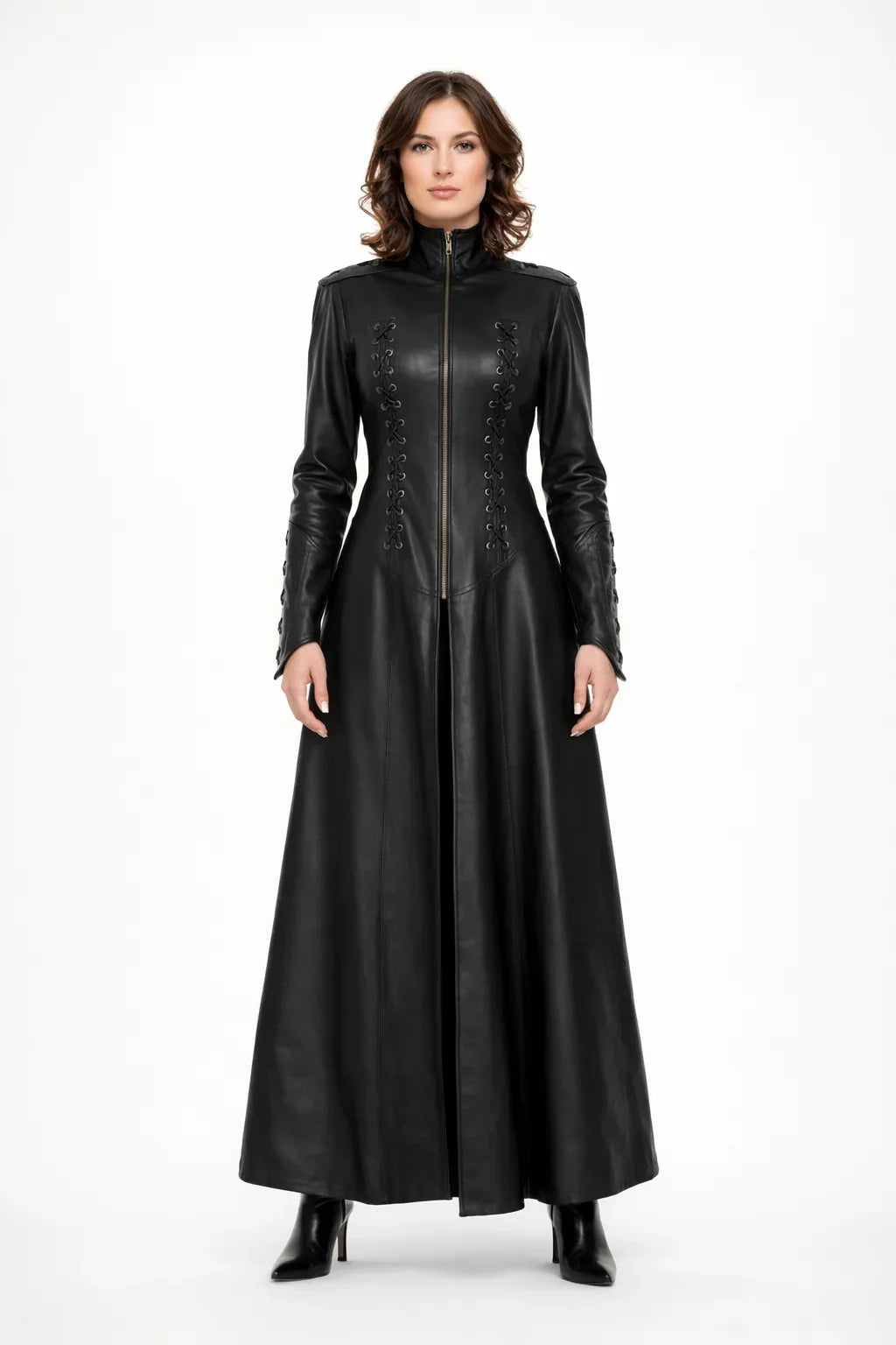 Women's Black Genuine Leather Long Trench Coat - Premium Cowhide, Slim Fit, High Collar, Lace-Up Detail Luxury Coat