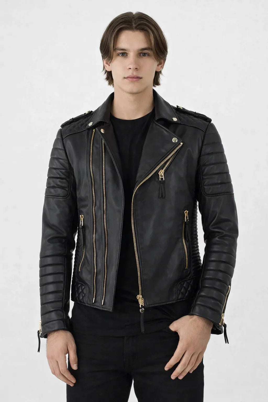 Men's Black Biker Leather Jacket with Quilted Sleeves