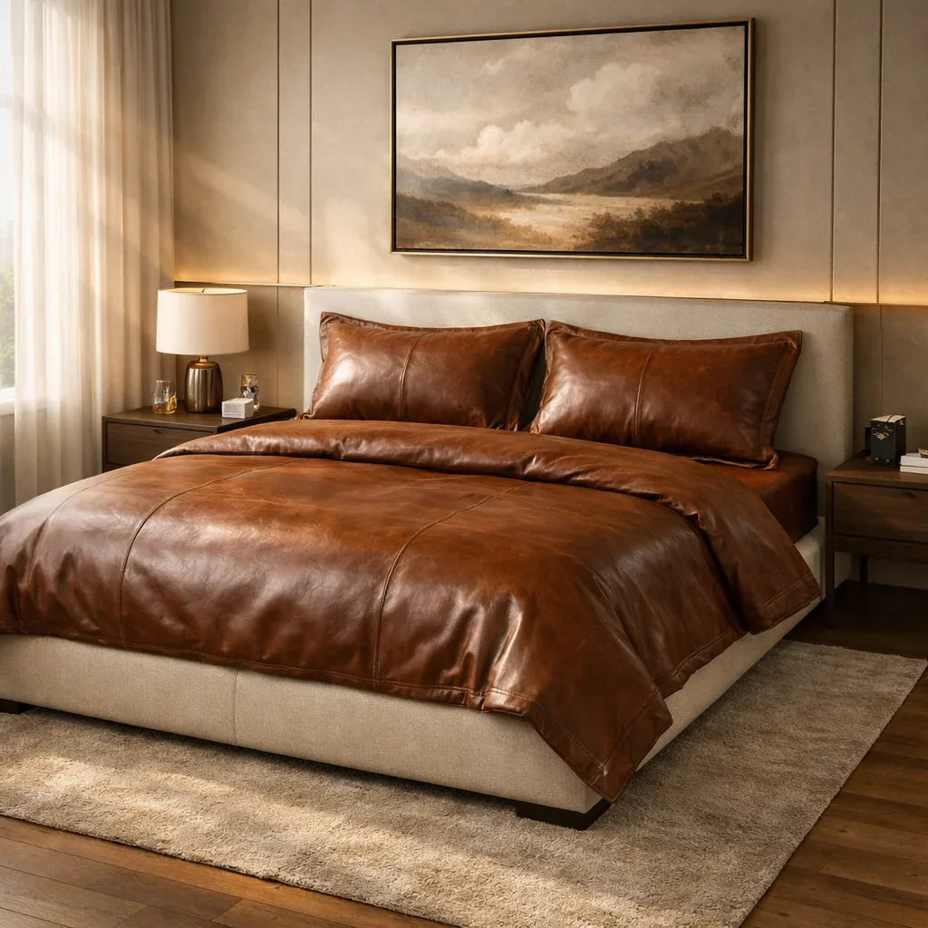 Luxury Brown Genuine Leather Bedding Set - Duvet Cover, Bedsheet & Pillowcases
