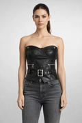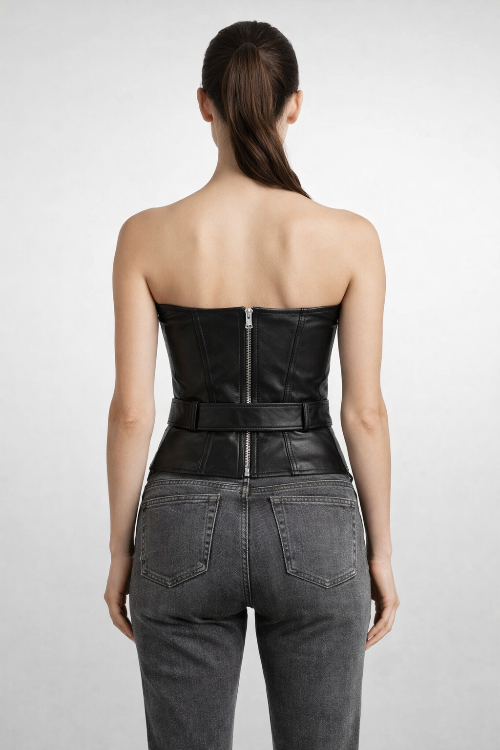 Crafted from premium genuine leather, the corset features a sculpted fit with reinforced paneling that enhances your natural curves. The integrated belt detail adds a bold statement while giving you control over the fit. Subtle zipper accents and fine stitching bring a refined finish, making it suitable for both elevated everyday styling and statement looks.